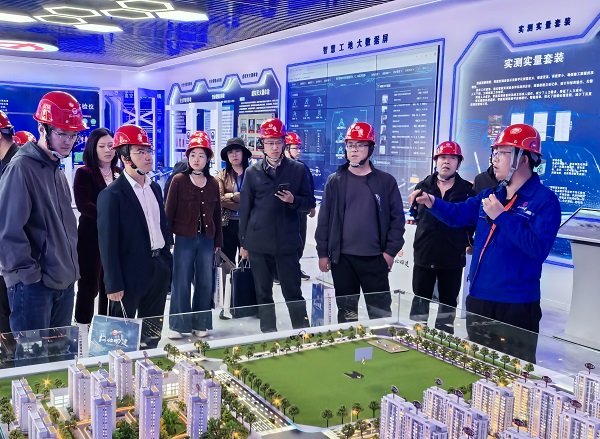 在智能建造指挥中心,项目技术总工向观摩团介绍了公司基本情况、工程概况,重点围绕项目智慧工地系统,讲解了物联监测、安全管理、质量管理、项目进度、360度全景等8大模块内容。项目部设立了智慧工地管理平台,将项目进度、质量、安全、劳务等各方面数据集中统一管理,方便了管理人员科学分析与决策;安装了塔吊在线监测、吊钩盲区可视化系统,保障吊装安全,提高了作业效率;应用了扬尘噪声在线监测、遥控器控制扬尘喷雾等智能系统,有效控制了扬尘污染……一系列实际应用及效果图片,充分展示了项目高质量、智慧化建设水平,观摩人员纷纷拿起手机拍照记录。